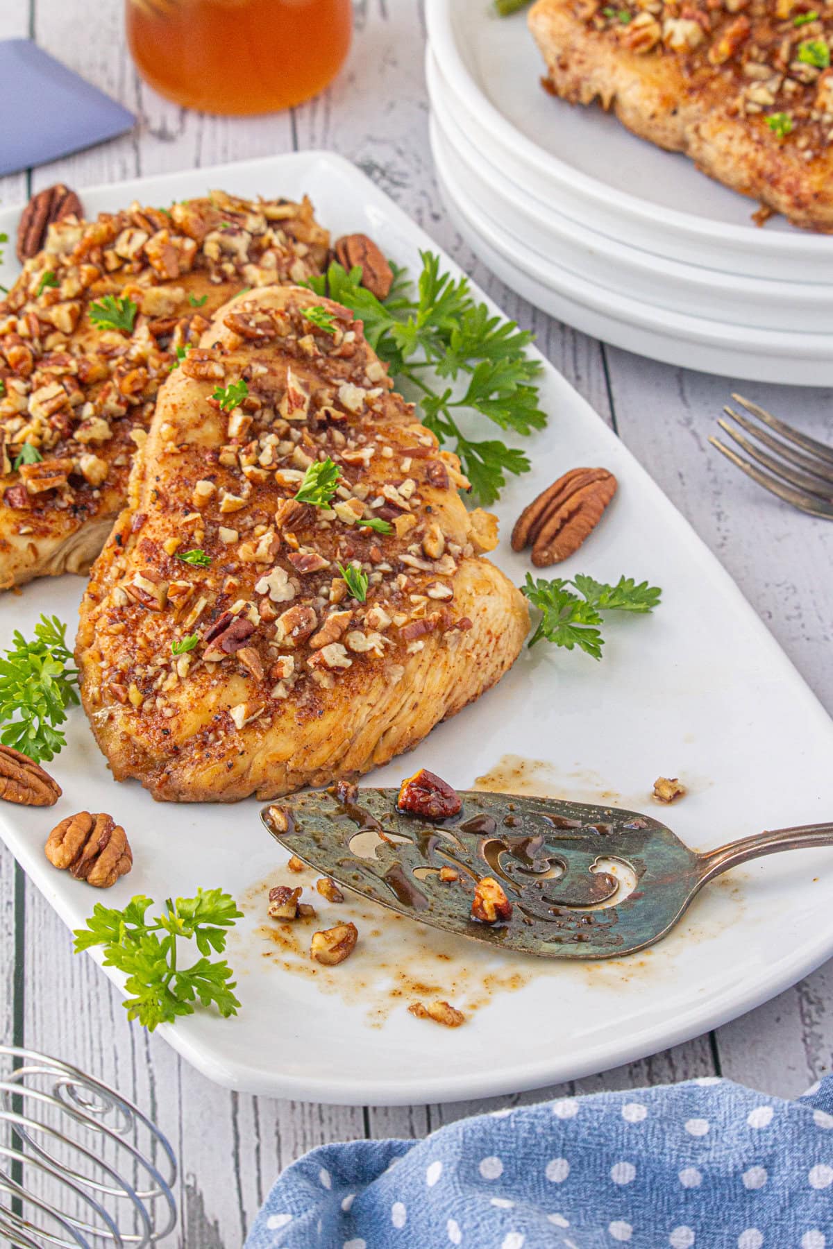 Be sure to scoop up any caramelized pecans that fall off the chicken to the bottom of the skillet. Don't let those sweet, crunchy bits go to waste.