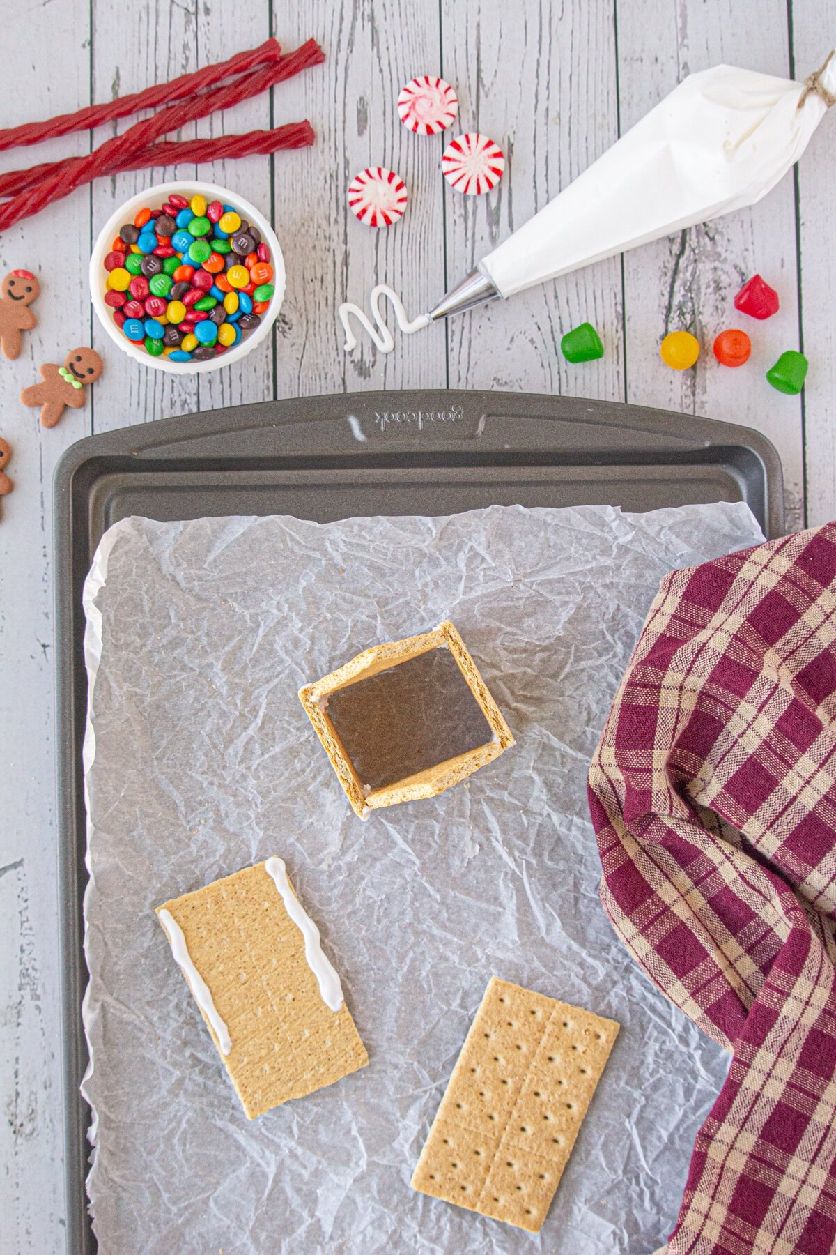 Be sure to read the tips above carefully. They'll make it so much easier to cut and assemble these graham cracker gingerbread houses!